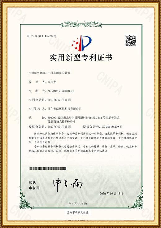 • 實(shí)用新型專利證書(一種車用噴涂裝置)