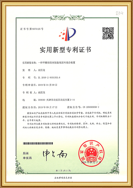 • 實(shí)用新型專利證書(一種甲醛清除劑的原料混合