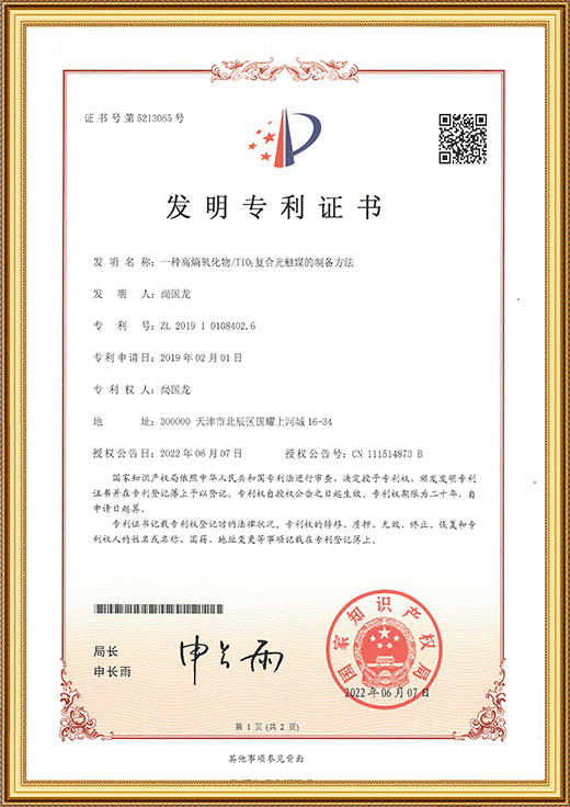 • 發(fā)明專利證書證書(一種高稿氧化物/Ti02復(fù)合光觸